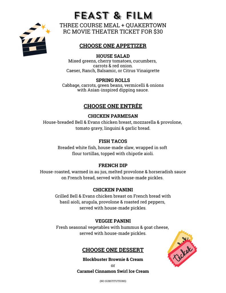Pre-fixed menu includes a complimentary movie ticket to R/C Richland Crossings Movies 12 (regular showings only; excludes RCXTREME). Valid Wednesdays, Thursdays, and Sundays.